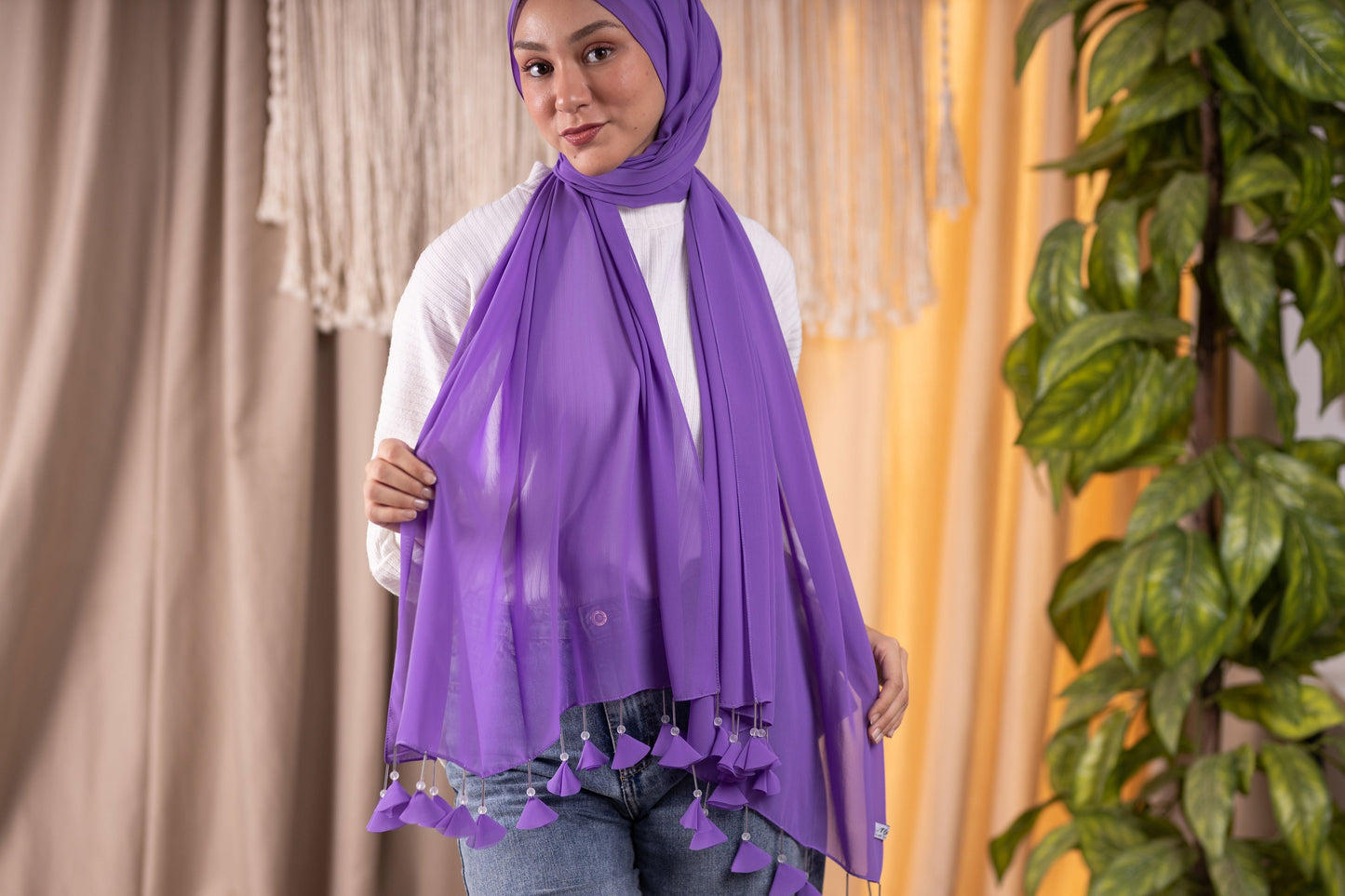 Discover the Tassel Wonders Collection. Each luscious chiffon rectangular scarf is handmade with intricate beads and laser-cut tassels on both ends, adding a touch of movement and fun to any outfit